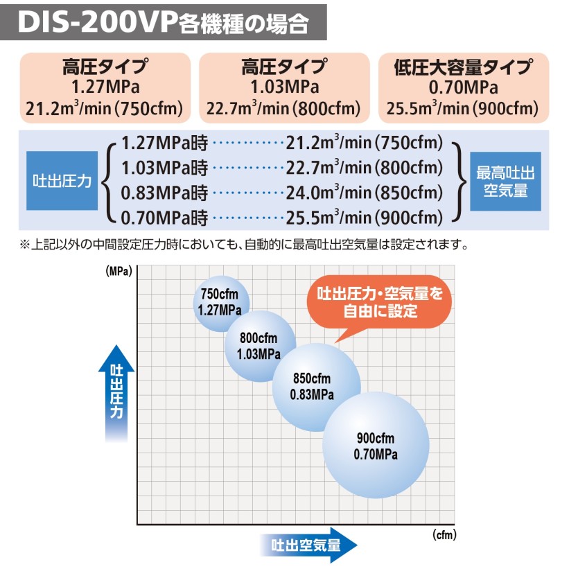最高圧力1.27MPa-750cfm~0.70MPa-900cfm
