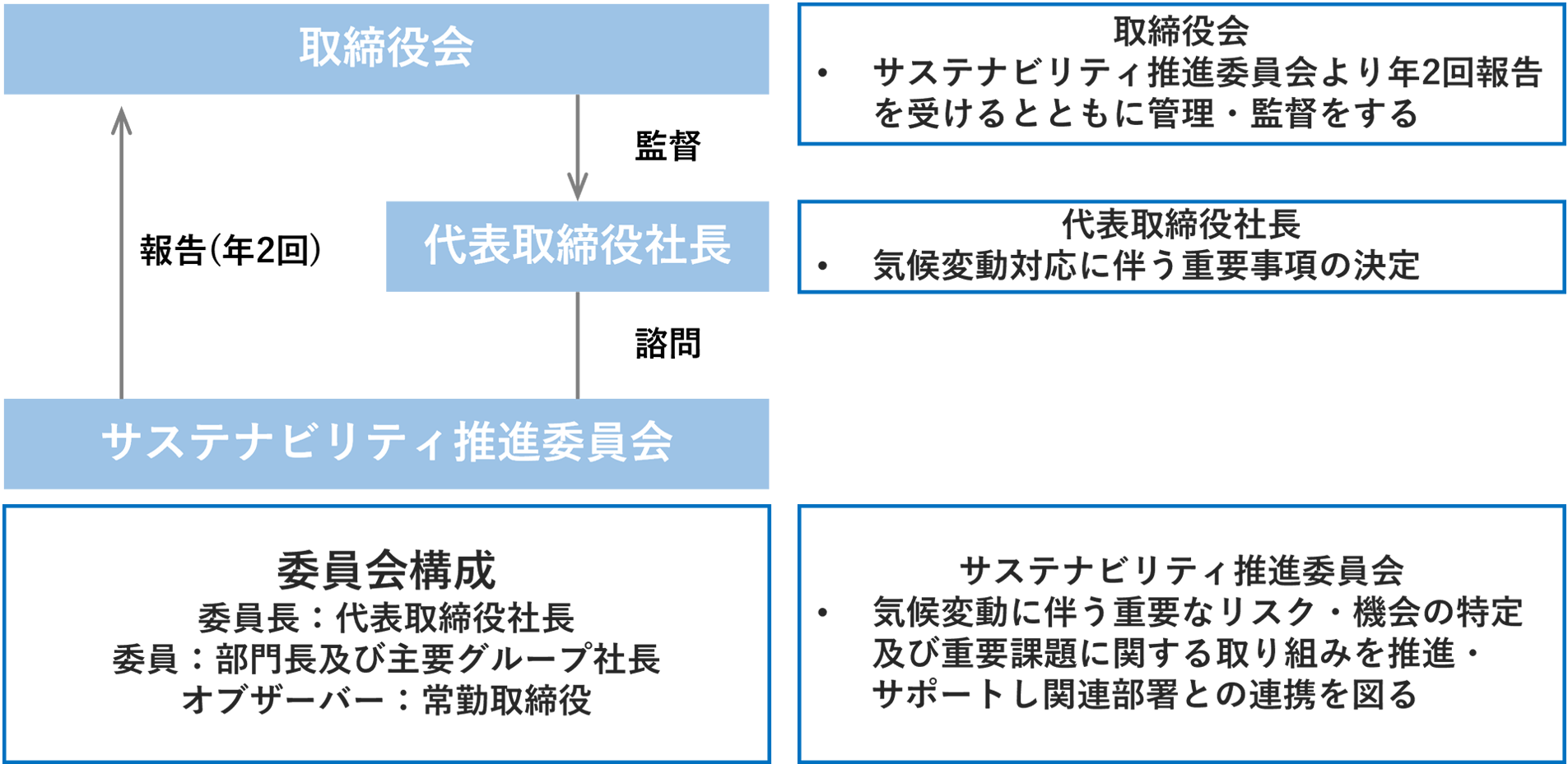 デンヨーグループでは、サステナビリティに関するマテリアリティを特定し適切にマネジメントするために代表取締役社長を委員長とする「サステナビリティ推進委員会」を設置しております。サステナビリティ推進委員会では、「気候変動」を含むサステナビリティに関連する重要なリスク・機会を特定しそれらに係る対応を策定し重要課題に関する取り組みを推進・サポートしています。また進捗をモニタリングすると共に関連部署との連携を密に図っています。これらの結果については取締役会に「年2回」報告され、気候変動対応に関する重要事項については代表取締役社長が決定するとともに、取締役会にて適切な指示・監督をしています。