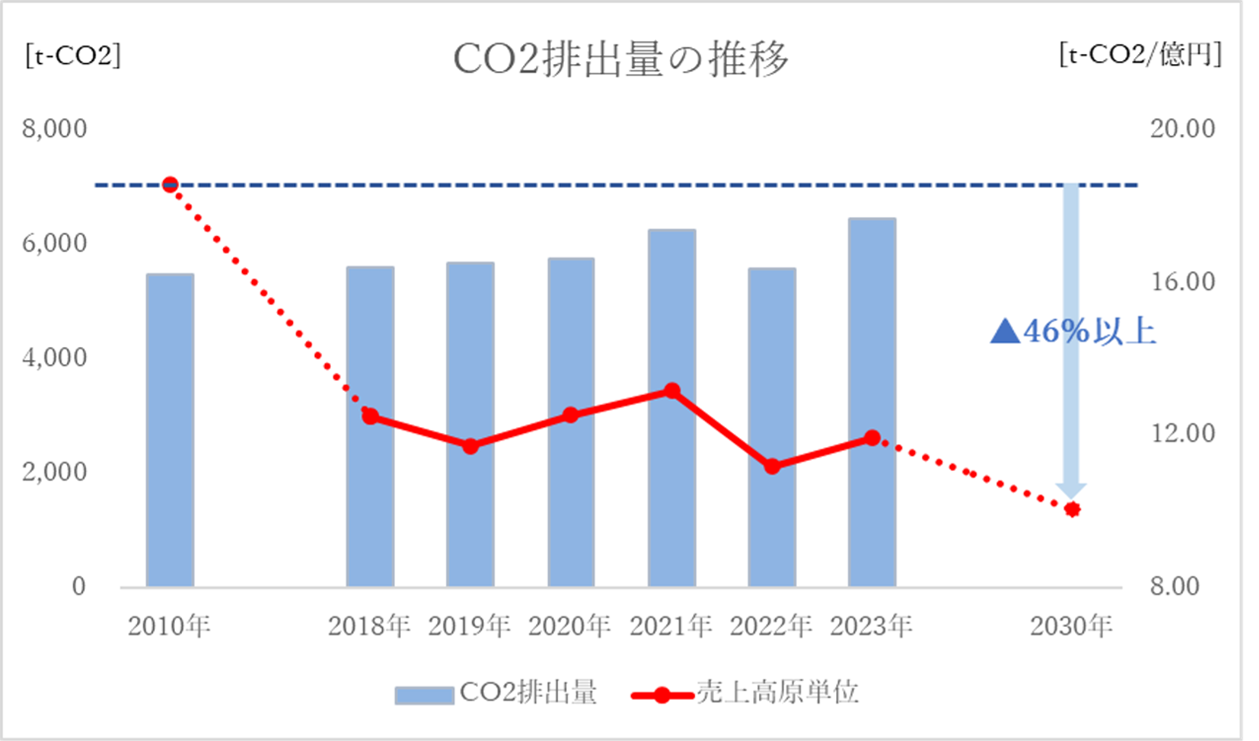 国内グループ会社でのScope1,2について、2030年度までにCO2排出量の売上高原単位を2010年度比で46%以上削減を目標としております。2010年度は、排出量5,496[t-CO2]、売上高原単位は18.58[t-CO2/億円]であり、2024年度の実績数値としては、排出量6,214[t-CO2]、売上高原単位は11.36[t-CO2/億円]となっております。